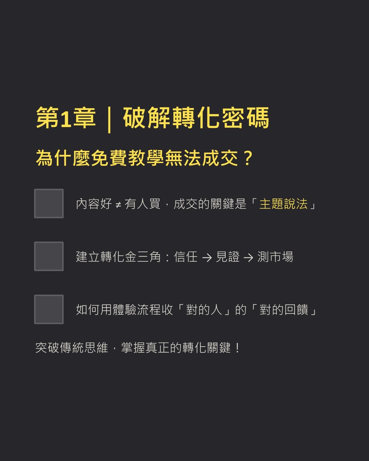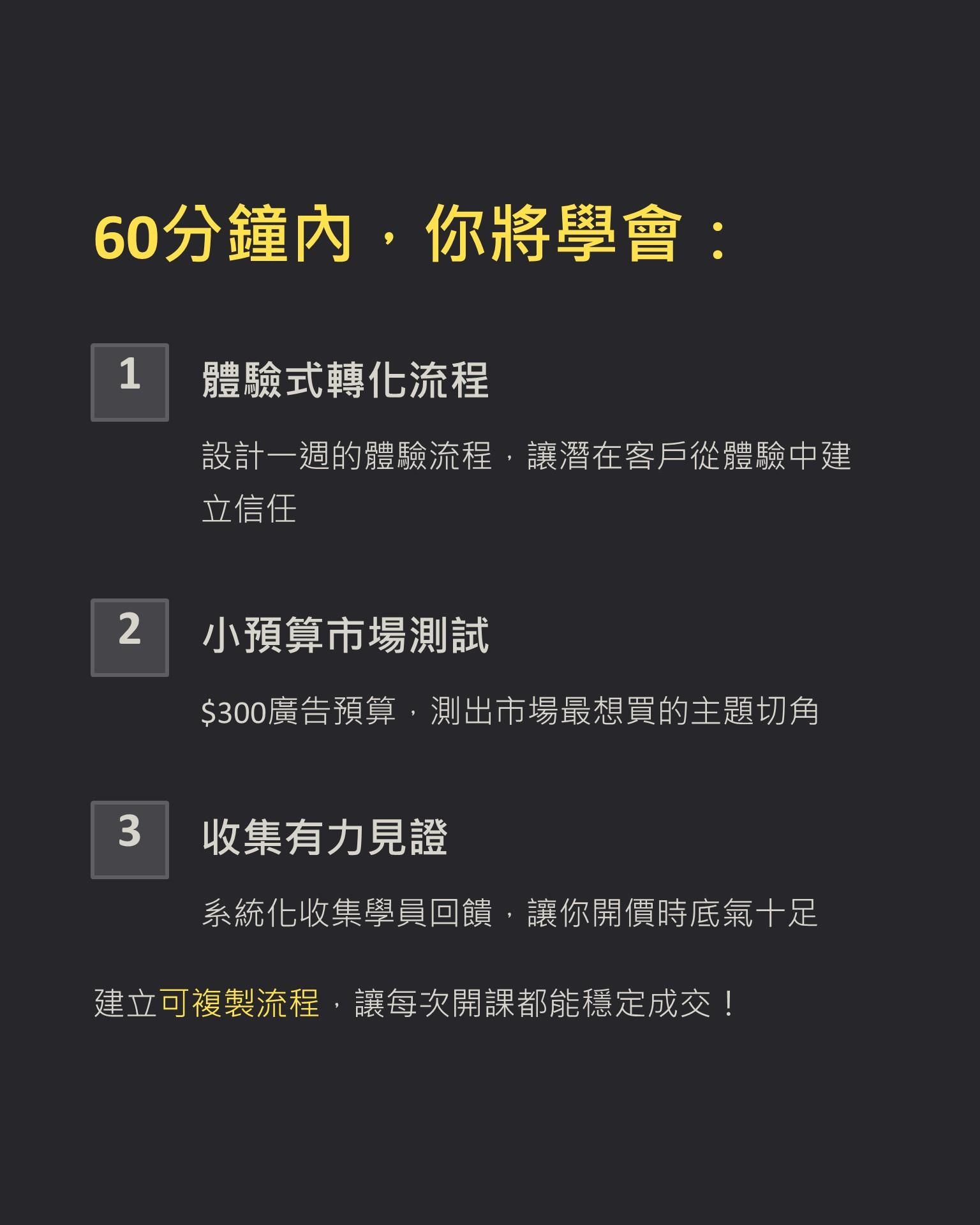 🎯 60分鐘內學會:如何設計一週的「體驗式轉化流程」,讓潛在客戶從體驗中建立信任,主動詢問你的付費服務