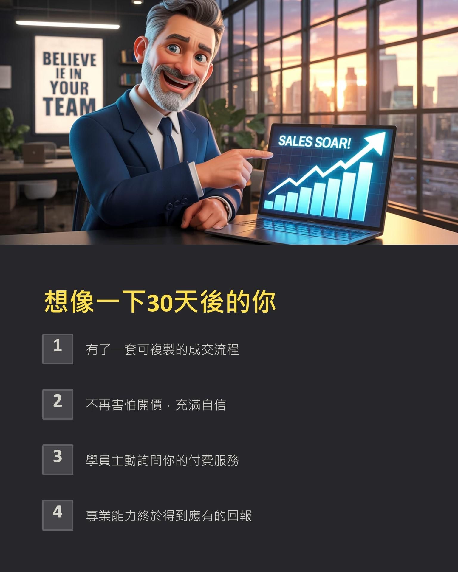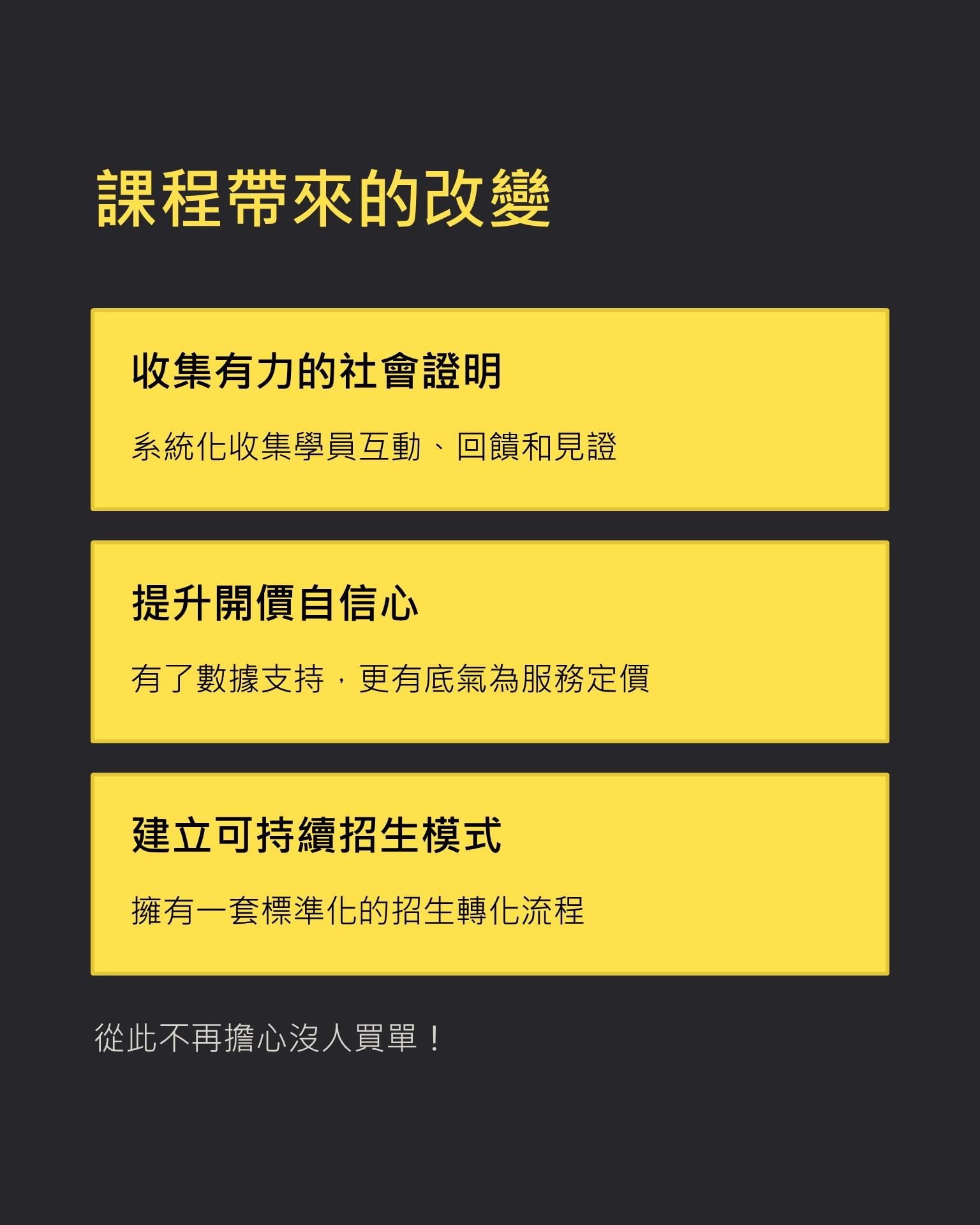 🎯 收集有力見證:系統化收集學員回饋、見證、數據,讓你開價時底氣十足