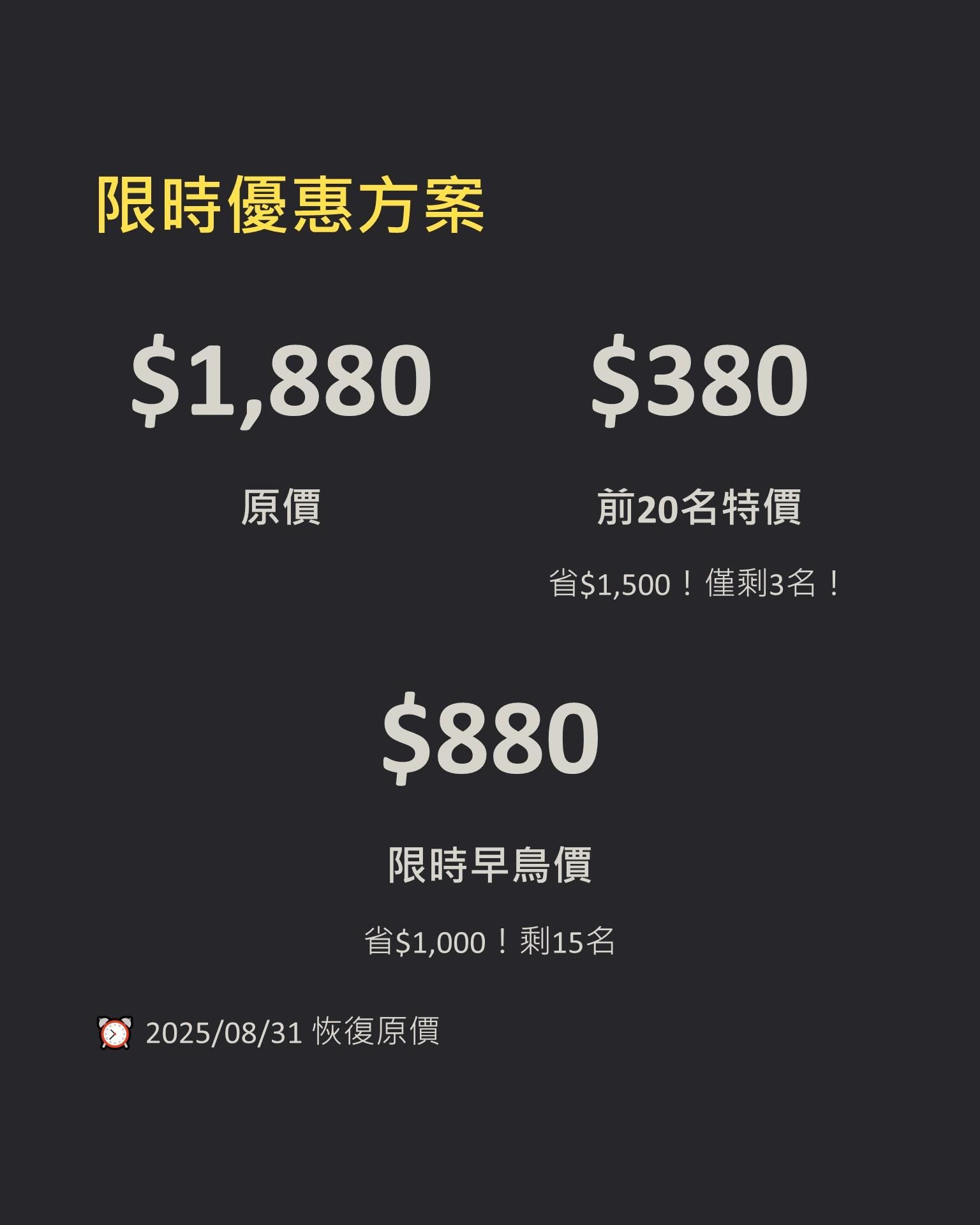原價$1880,8月特惠價$880,前20員只要$380